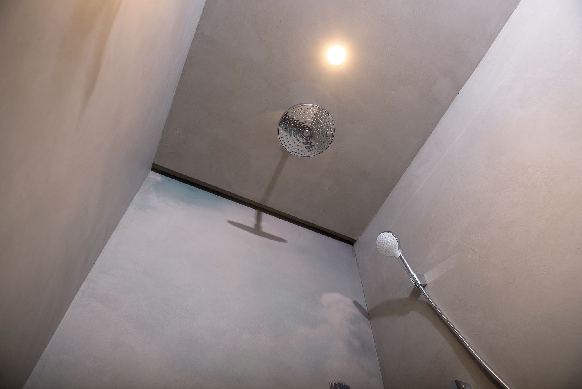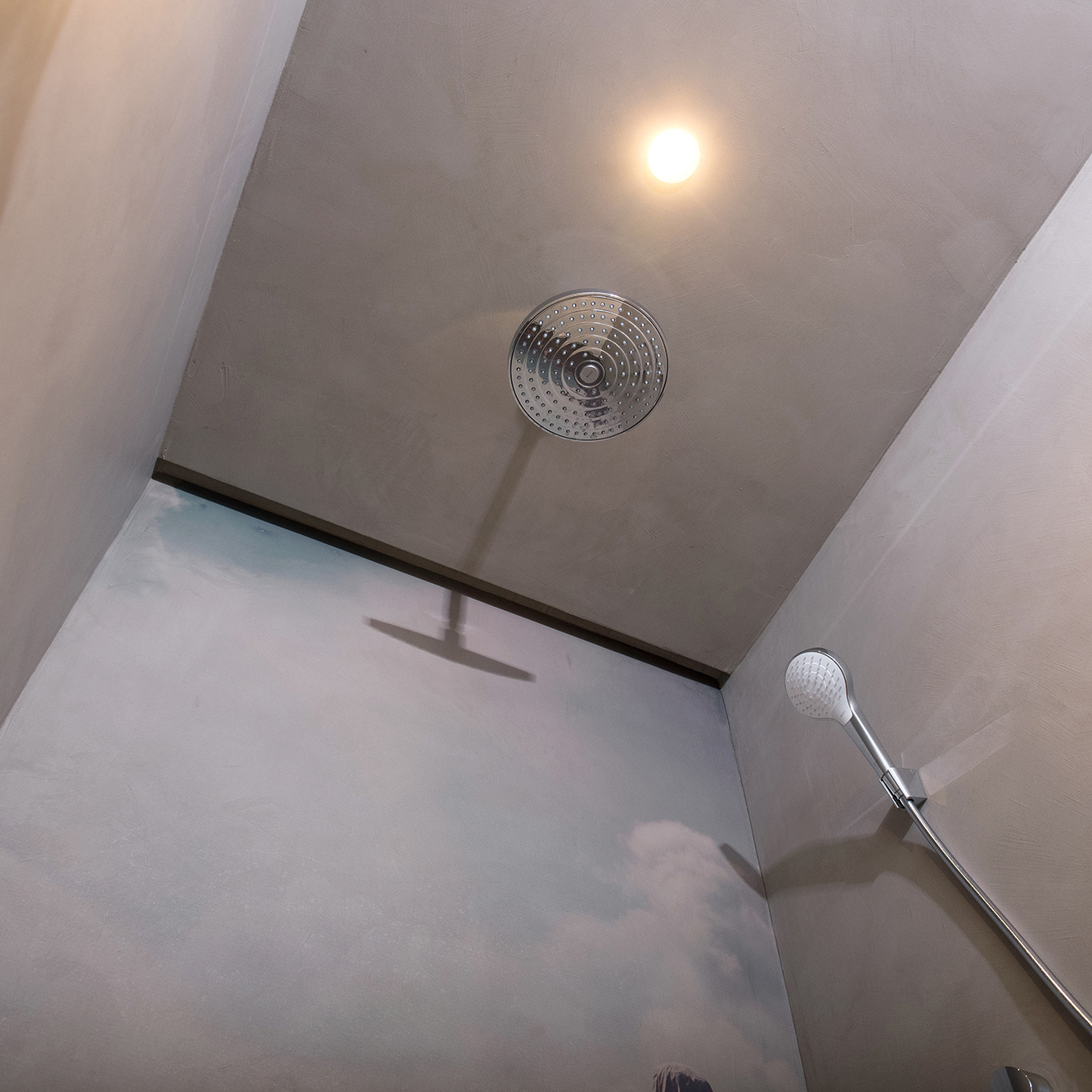 In diesem Badezimmer haben wir eine gemütliche Spa-Landschaft geschaffen, mit fugenloser Dusche, Beton-Optik an der Wand und modernem Terrazzo-Boden.