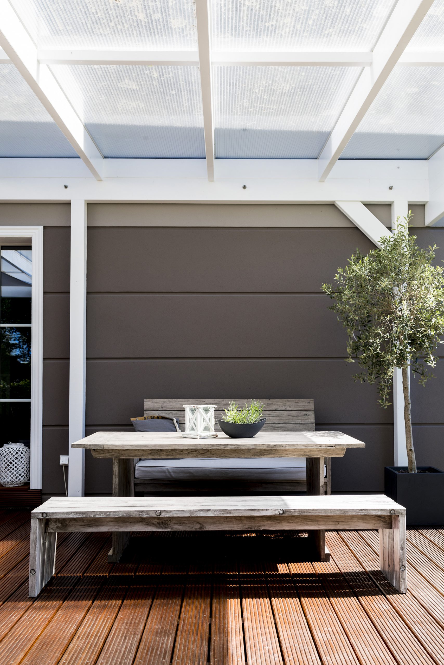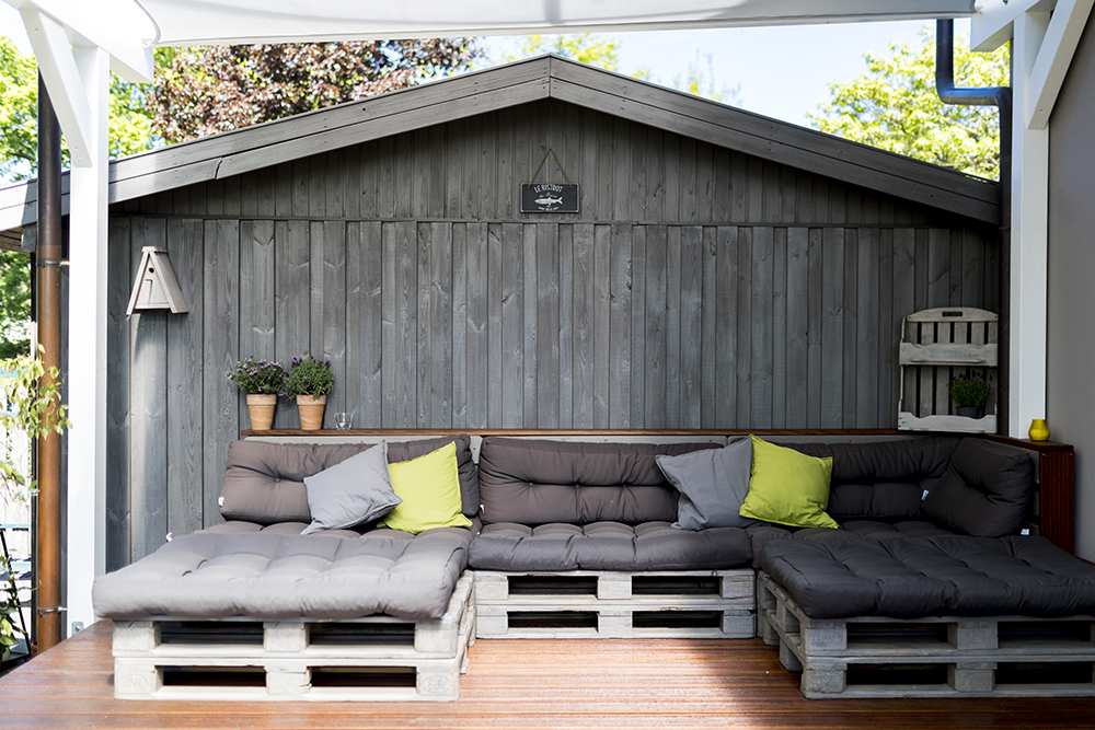 Witterungsbeständig und robust sind diese Materialien behandelt. Der Kontrast zwischen den hochwertigen Terrassendielen und den einfachen Paletten macht diese Terrasse besonders.