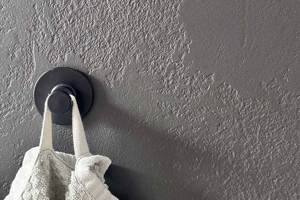 Die strukturierte Wand haben wir Glass verputzt, die Fliesen  übergeputzt und neuen Boden verlegt. Auch der Wasseranschluss wurde für das Waschbecken verlegt und neues Porzellan angebracht. Es ist ein schöner neuer Raum geworden.